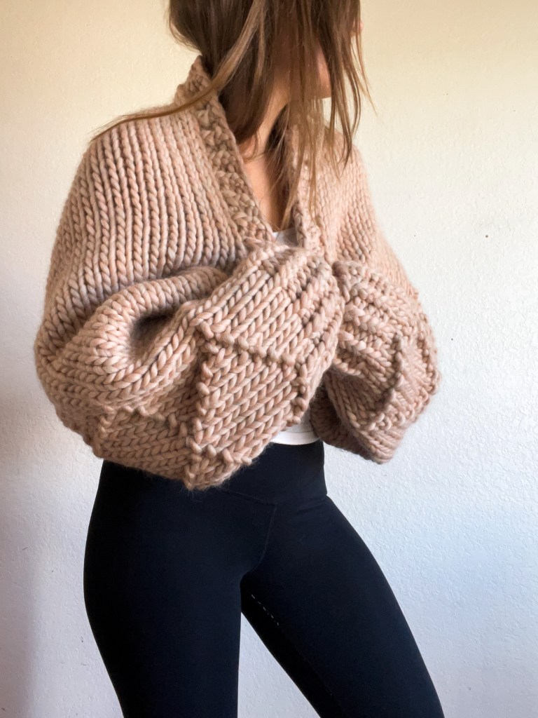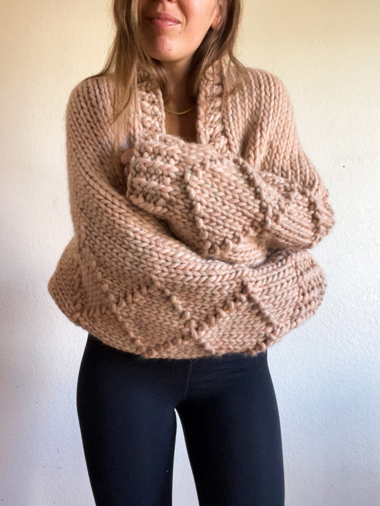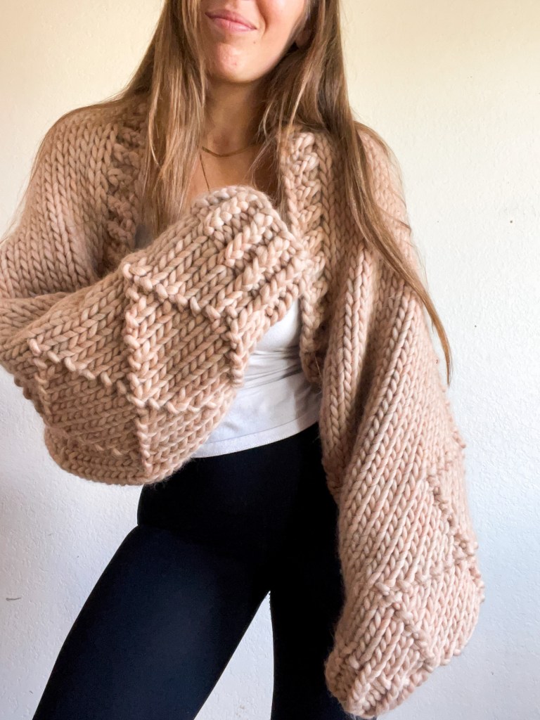 The nova shawl is knit in one long piece on a set of 15mm straight knitting needles. Any beginner knitter won’t have a problem doing this one! It uses basic stitches and I added a fun little design to the sleeves to mix things up! Still just using your basic knit and purl stitch.