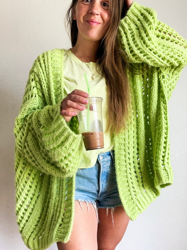 2. The Bring Me Coffee cardi. Super chill, airy, and cozy. This is the ultimate for enjoying that summer coffee. Slip it on with a tank and shorts, and you’re ready for all the coffee feels.