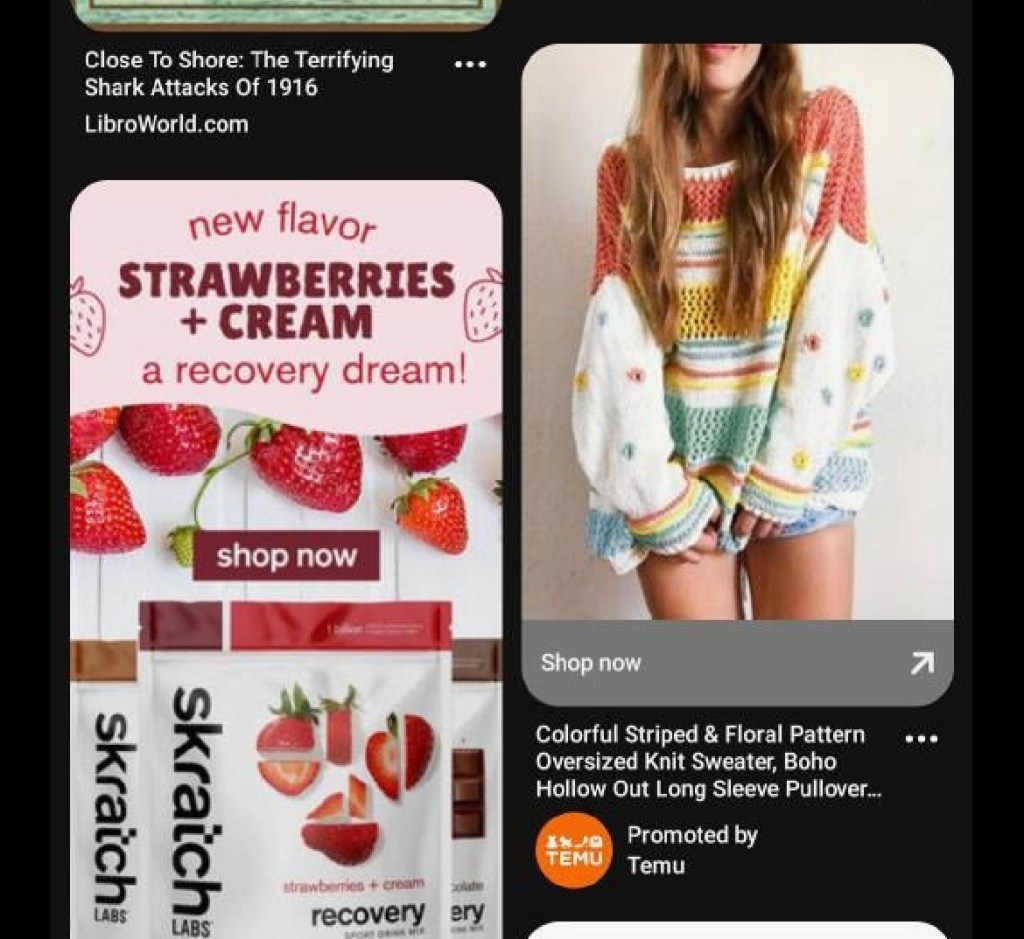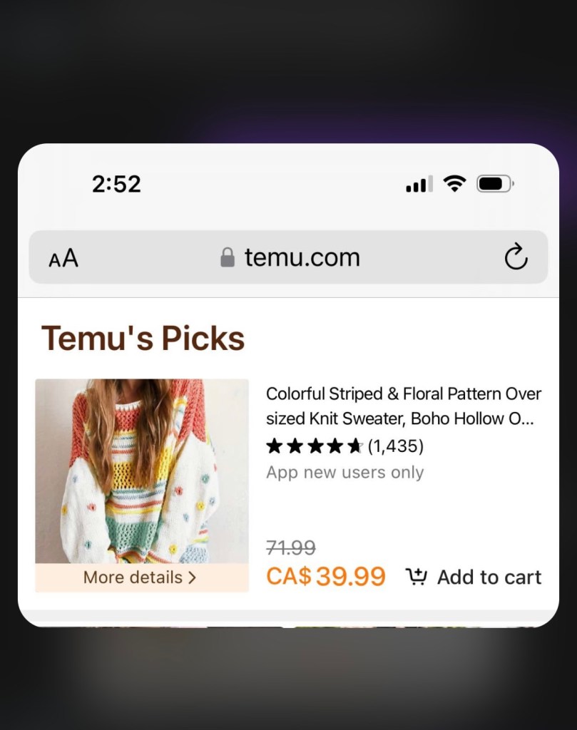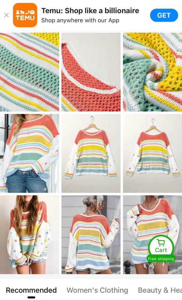The recent Temu incident is the one that finally got to me. Temu is using my photos of my summer daisy sweater as advertising for Pinterest ads. They’re using my photos to sell copycats of the sweater on their site. I’m not sure how long this has been going on, but I have had so many people suddenly finding my sweater on there and sending me images, links, etc. I even had an email from a media company in Germany wondering if I would be open to an interview regarding my stolen work on Temu.