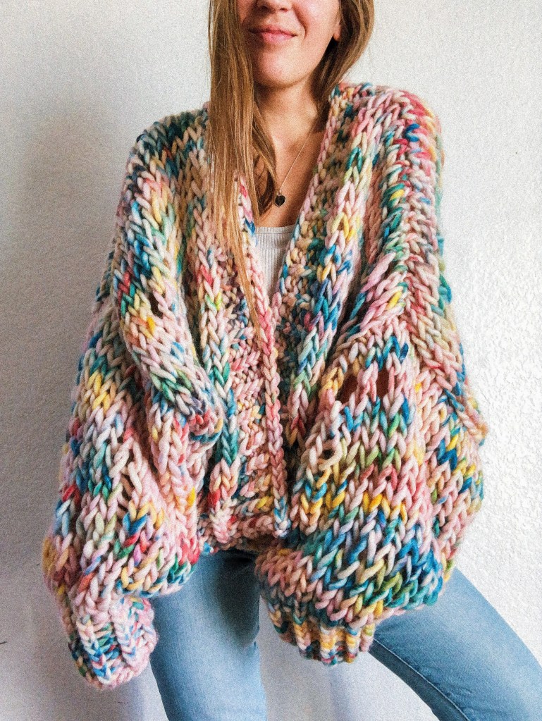 If you’re looking for patterns in these yarns, click the shop button in the menu above! A couple favorites of many is the winter blues sweater and the lost road trip cardigan pictured below. The winter blues sweater is an easy pattern and many have knit it as their first sweater! The lost road trip cardigan is a bit more for advanced beginners, but can be knit easier if preferred. I’ve had a few people ask how to knit it without the distressing details, and all you will do is simply knit in stockinette stitch, without adding the make ones (except for sleeve increases), yarn overs, or dropping stitches. If you decide not to do those, it’s an easy level.:)