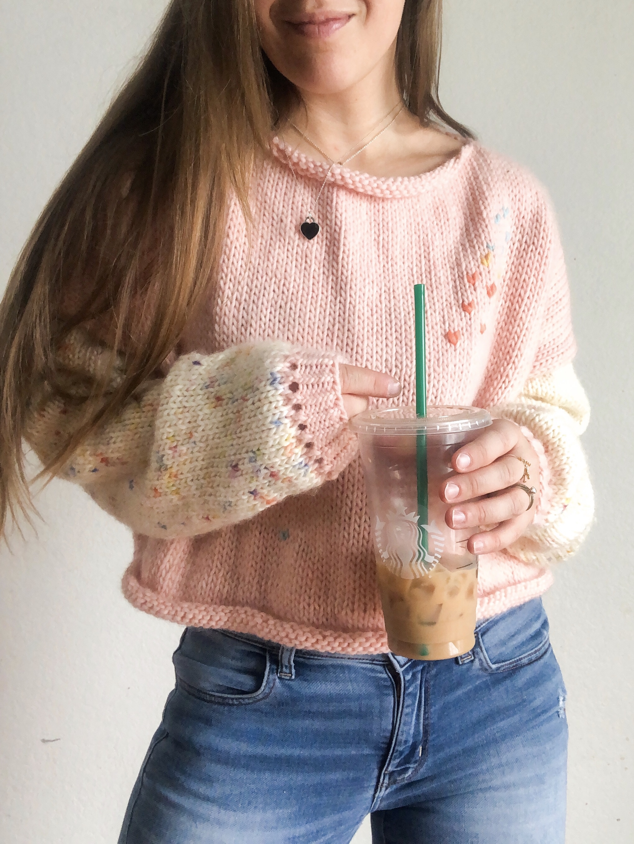 I was going to do the full sweater in pink, but changed my mind when I was going through my yarn and saw some leftover speckled meriwool. It added such a perfect contrast to the sweater! I also decided to add a little to the wrists just for something extra.