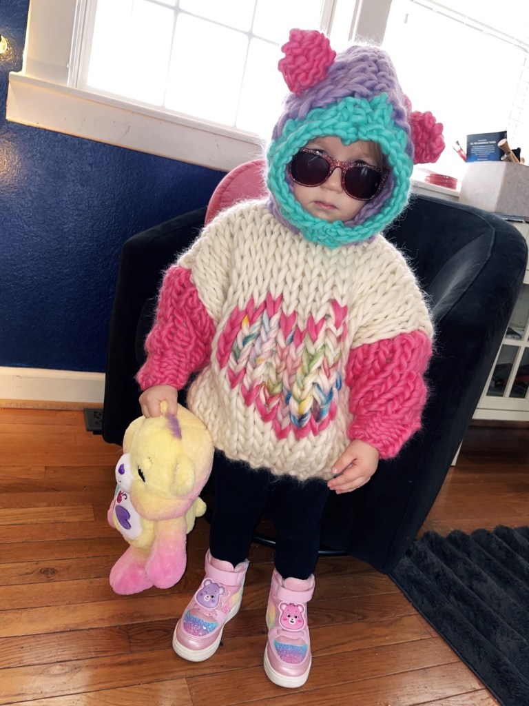 I love knitting sweaters for this girly. She’s already loving clothes at this little age, taking after my own heart. She picks out her outfits each day, even has her favorites! When I knit her a sweater, she’s in love. She will hug it, snuggle on it, and not want to take it off.